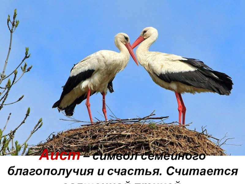 Слайд 12Аист – символ семейного благополучия и счастья. Считается священной птицей.