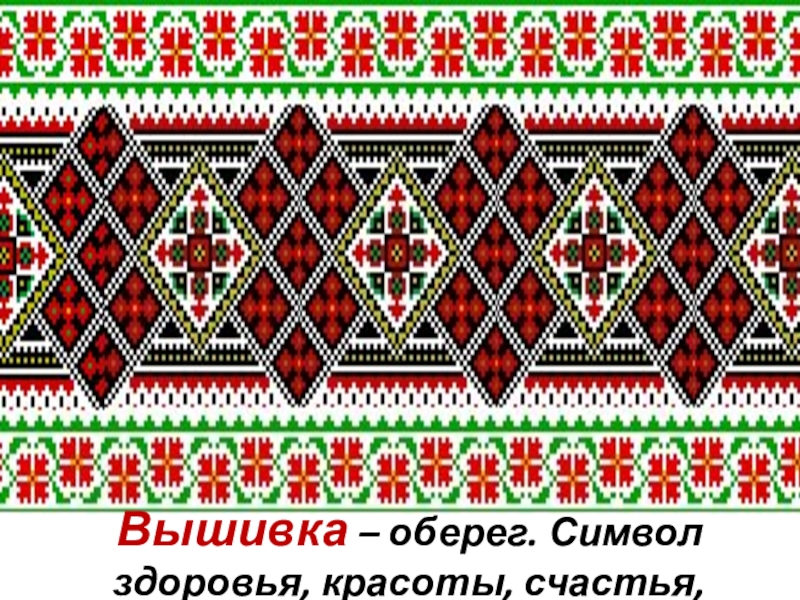Слайд 7 Вышивка – оберег. Символ здоровья, красоты, счастья, честности, любви.