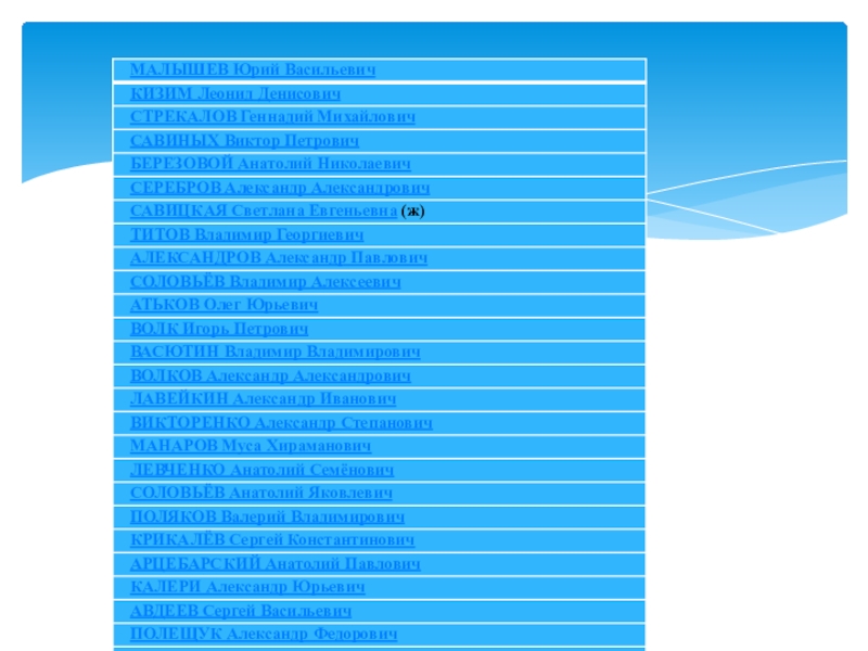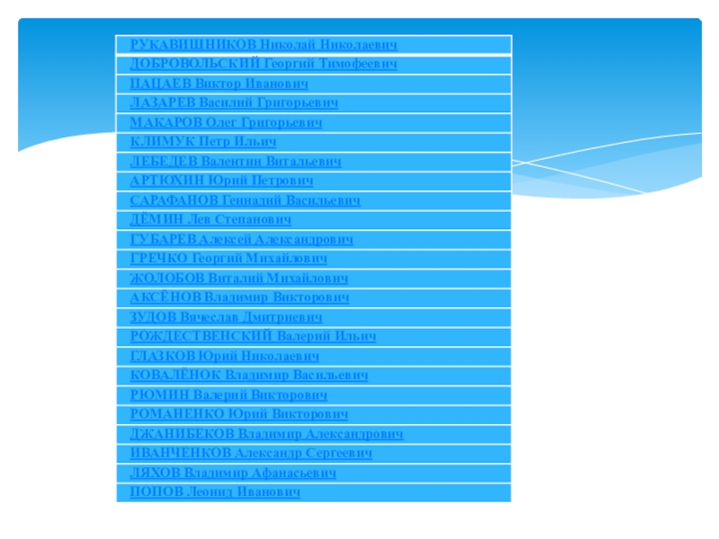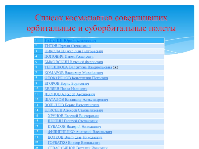Слайд 24Список космонавтов совершивших орбитальные и суборбитальные полеты