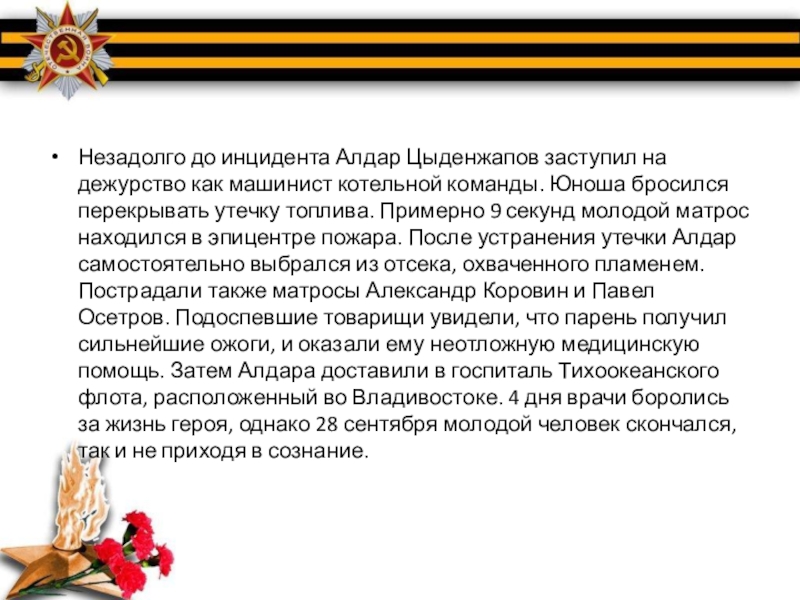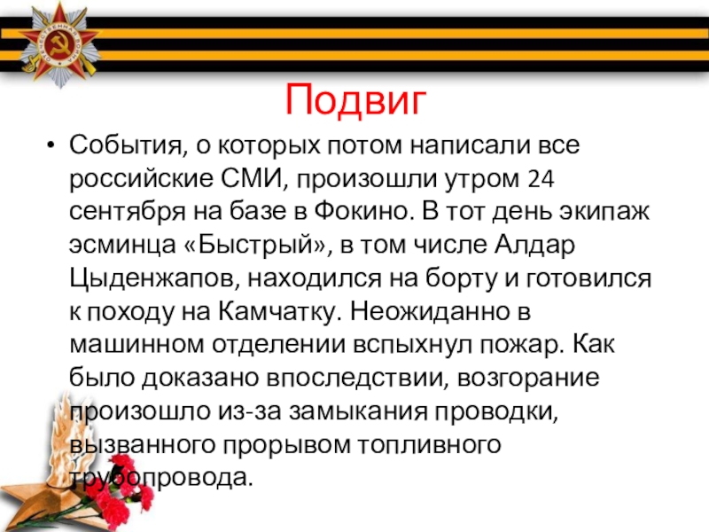 сентября на базе в Фокино. В тот день экипаж эсминца «Быстрый», в том числе Алдар Цыденжапов, находился на борту и готовился к походу на Камчатку. Неожиданно в машинном отделении вспыхнул пожар. Как было доказано впоследствии, возгорание произошло из-за замыкания проводки, вызванного прорывом топливного трубопровода.