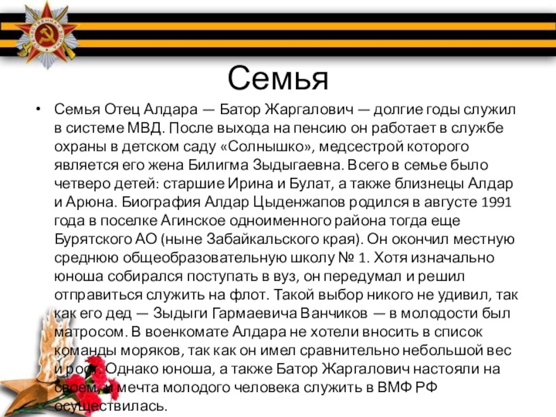 системе МВД. После выхода на пенсию он работает в службе охраны в детском саду «Солнышко», медсестрой которого является его жена Билигма Зыдыгаевна. Всего в семье было четверо детей: старшие Ирина и Булат, а также близнецы Алдар и Арюна. Биография Алдар Цыденжапов родился в августе 1991 года в поселке Агинское одноименного района тогда еще Бурятского АО (ныне Забайкальского края). Он окончил местную среднюю общеобразовательную школу № 1. Хотя изначально юноша собирался поступать в вуз, он передумал и решил отправиться служить на флот. Такой выбор никого не удивил, так как его дед — Зыдыги Гармаевича Ванчиков — в молодости был матросом. В военкомате Алдара не хотели вносить в список команды моряков, так как он имел сравнительно небольшой вес и рост. Однако юноша, а также Батор Жаргалович настояли на своем, и мечта молодого человека служить в ВМФ РФ осуществилась.