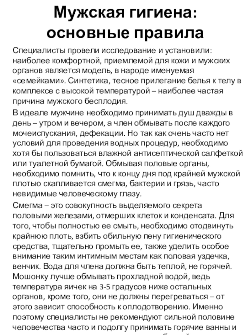 В идеале мужчине необходимо принимать душ дважды в день – утром и вечером, а член обмывать после каждого мочеиспускания, дефекации. Но так как очень часто нет условий для проведения водных процедур, необходимо хотя бы пользоваться влажной антисептической салфеткой или туалетной бумагой. Обмывая половые органы, необходимо помнить, что к концу дня под крайней мужской плотью скапливается смегма, бактерии и грязь, часто невидимые человеческому глазу.
