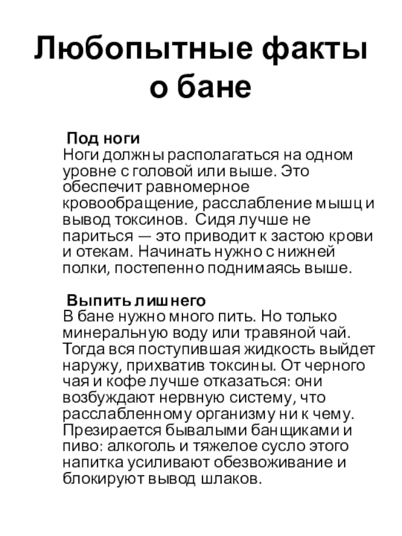 В бане нужно много пить. Но только минеральную воду или травяной чай. Тогда вся поступившая жидкость выйдет наружу, прихватив токсины. От черного чая и кофе лучше отказаться: они возбуждают нервную систему, что расслабленному организму ни к чему. Презирается бывалыми банщиками и пиво: алкоголь и тяжелое сусло этого напитка усиливают обезвоживание и блокируют вывод шлаков.
