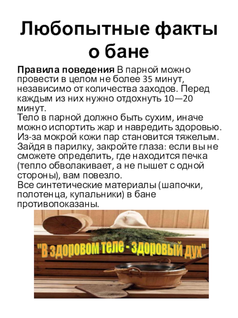 Все синтетические материалы (шапочки, полотенца, купальники) в бане противопоказаны.
