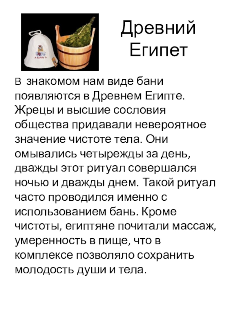 В знакомом нам виде бани появляются в Древнем Египте. Жрецы