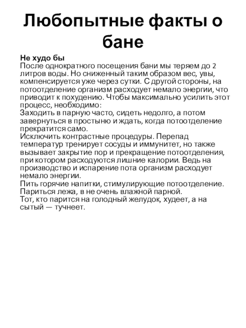 до 2 литров воды. Но сниженный таким образом вес, увы, компенсируется уже через сутки. С другой стороны, на потоотделение организм расходует немало энергии, что приводит к похудению. Чтобы максимально усилить этот процесс, необходимо: