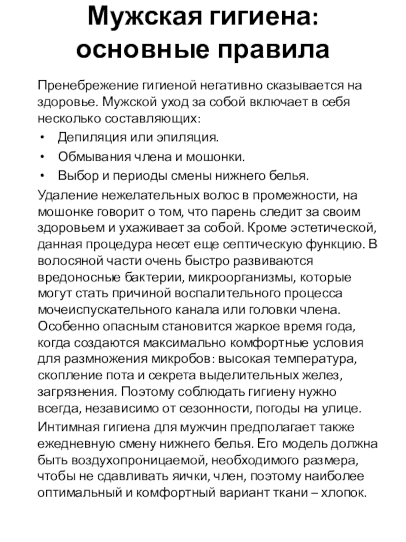 Интимная гигиена для мужчин предполагает также ежедневную смену нижнего белья. Его модель должна быть воздухопроницаемой, необходимого размера, чтобы не сдавливать яички, член, поэтому наиболее оптимальный и комфортный вариант ткани – хлопок.