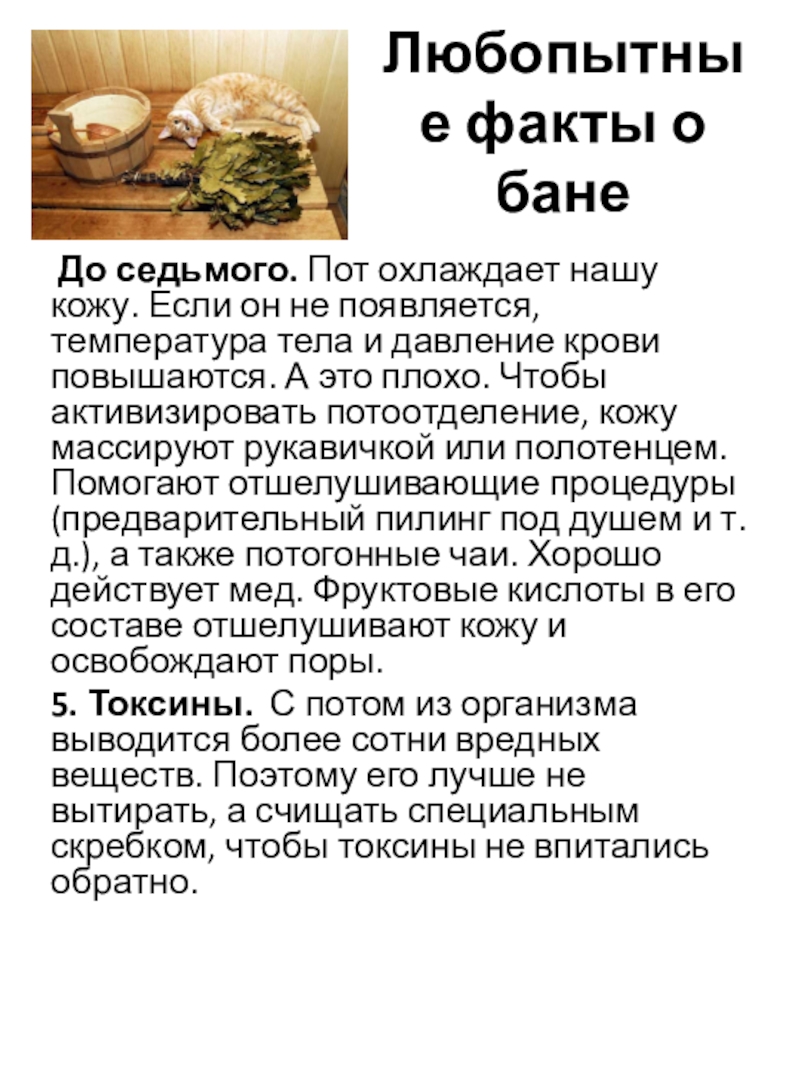 он не появляется, температура тела и давление крови повышаются. А это плохо. Чтобы активизировать потоотделение, кожу массируют рукавичкой или полотенцем. Помогают отшелушивающие процедуры (предварительный пилинг под душем и т.д.), а также потогонные чаи. Хорошо действует мед. Фруктовые кислоты в его составе отшелушивают кожу и освобождают поры.