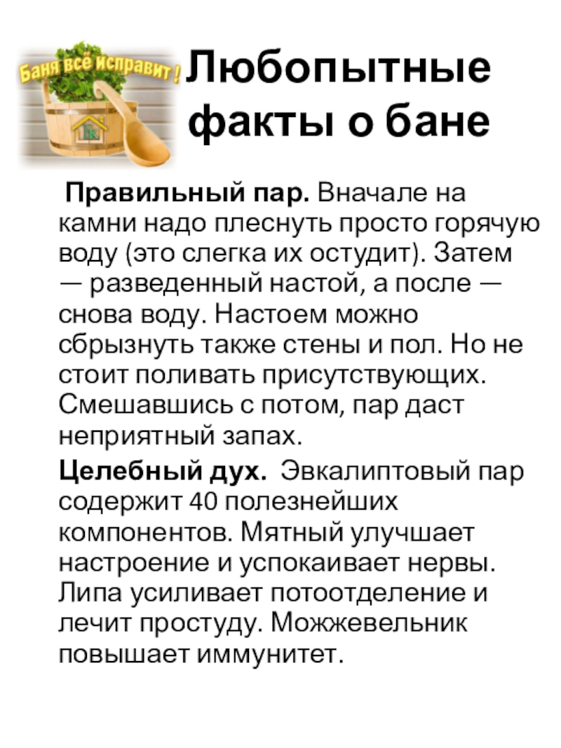 Целебный дух. Эвкалиптовый пар содержит 40 полезнейших компонентов. Мятный улучшает настроение и успокаивает нервы. Липа усиливает потоотделение и лечит простуду. Можжевельник повышает иммунитет.