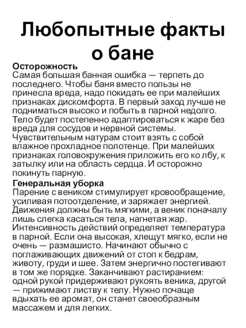 Чтобы баня вместо пользы не принесла вреда, надо покидать ее при малейших признаках дискомфорта. В первый заход лучше не подниматься высоко и побыть в парной недолго. Тело будет постепенно адаптироваться к жаре без вреда для сосудов и нервной системы. Чувствительным натурам стоит взять с собой влажное прохладное полотенце. При малейших признаках головокружения приложить его ко лбу, к затылку или на область сердца. И осторожно покинуть парную.