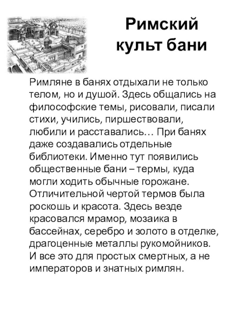 душой. Здесь общались на философские темы, рисовали, писали стихи, учились, пиршествовали, любили и расставались… При банях даже создавались отдельные библиотеки. Именно тут появились общественные бани – термы, куда могли ходить обычные горожане. Отличительной чертой термов была роскошь и красота. Здесь везде красовался мрамор, мозаика в бассейнах, серебро и золото в отделке, драгоценные металлы рукомойников. И все это для простых смертных, а не императоров и знатных римлян.