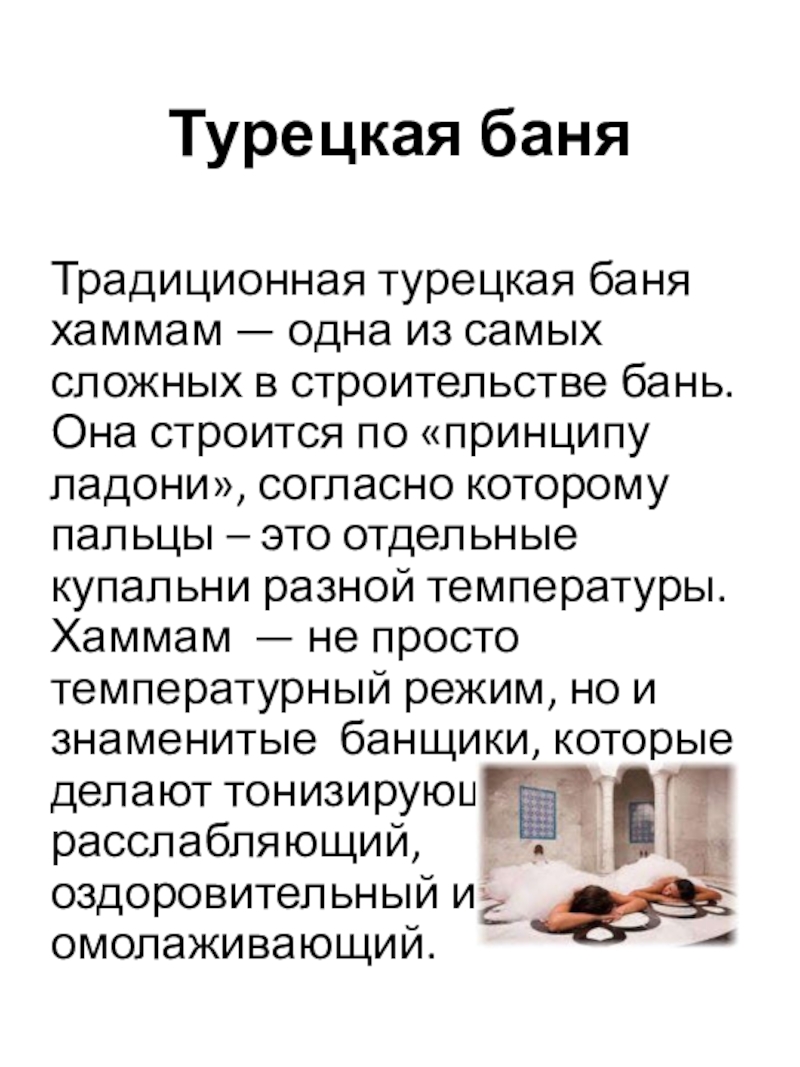 строительстве бань. Она строится по «принципу ладони», согласно которому пальцы – это отдельные купальни разной температуры. Хаммам — не просто температурный режим, но и знаменитые банщики, которые делают тонизирующий, расслабляющий, оздоровительный и омолаживающий.