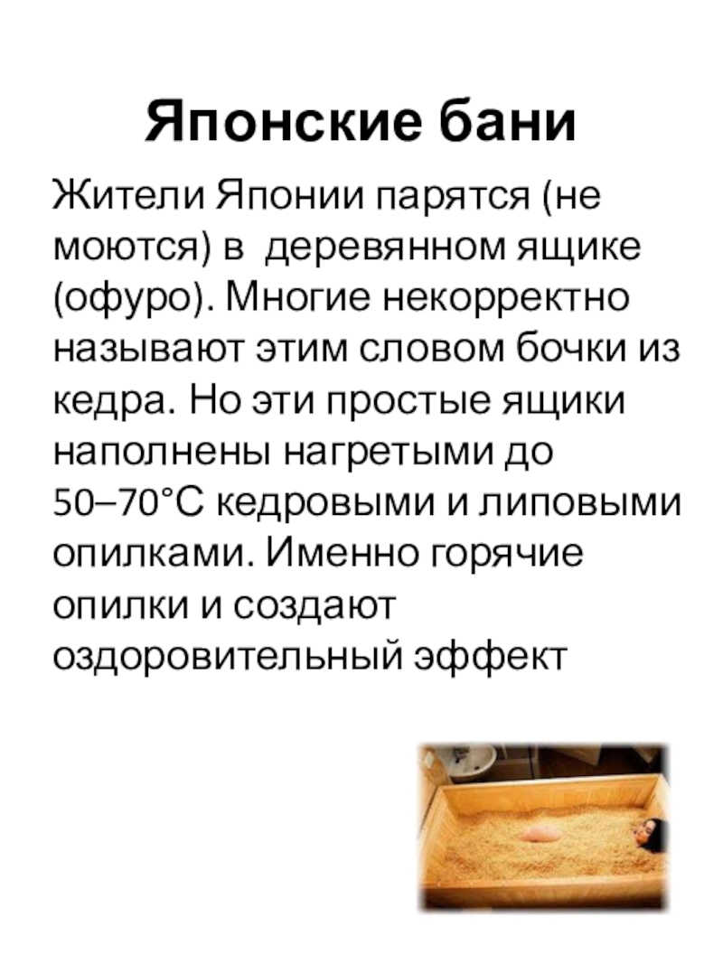 Жители Японии парятся (не моются) в деревянном ящике (офуро). Многие