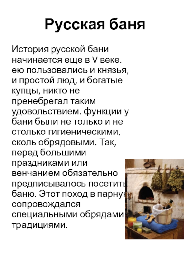 и князья, и простой люд, и богатые купцы, никто не пренебрегал таким удовольствием. функции у бани были не только и не столько гигиеническими, сколь обрядовыми. Так, перед большими праздниками или венчанием обязательно предписывалось посетить баню. Этот поход в парную сопровождался специальными обрядами и традициями.