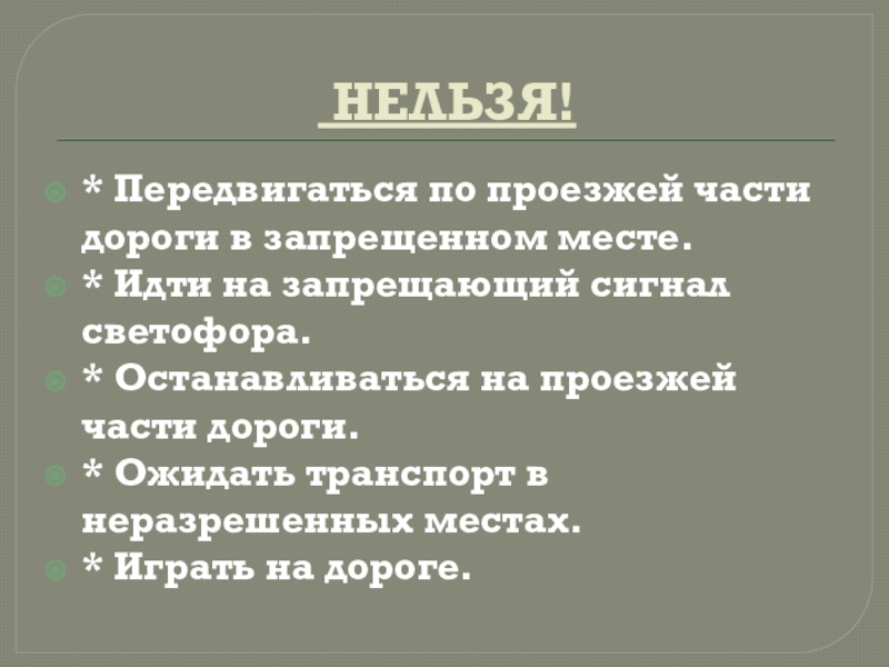 НЕЛЬЗЯ!* Передвигаться по проезжей части дороги в запрещенном месте.* Идти на запрещающий