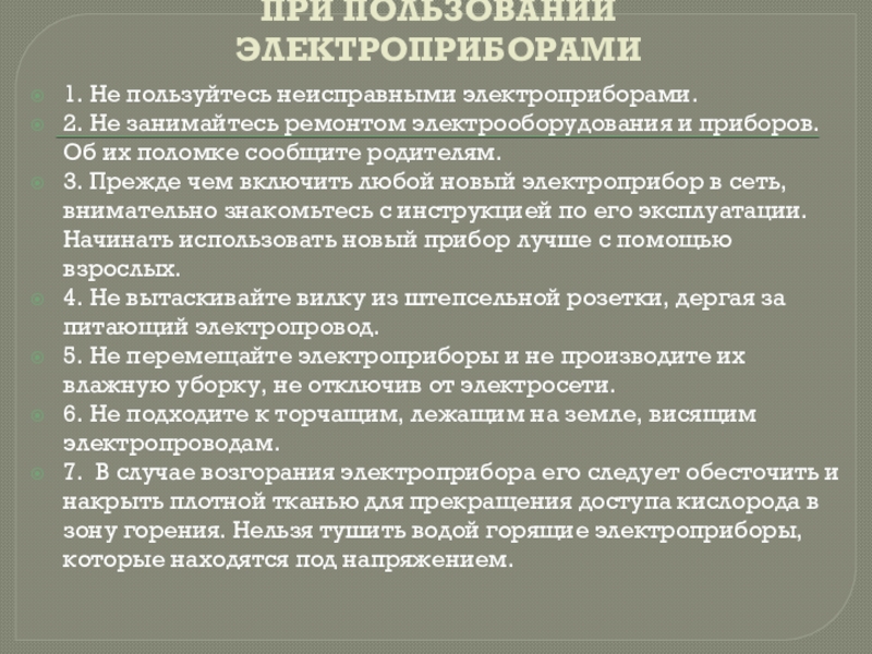 ПРИ ПОЛЬЗОВАНИИ ЭЛЕКТРОПРИБОРАМИ 1. Не пользуйтесь неисправными электроприборами.2. Не занимайтесь ремонтом электрооборудования и приборов. Об их поломке со­общите родителям.3. Прежде чем включить любой новый электроприбор в сеть, внимательно зна­комьтесь с инструкцией по его эксплуатации. Начинать использовать