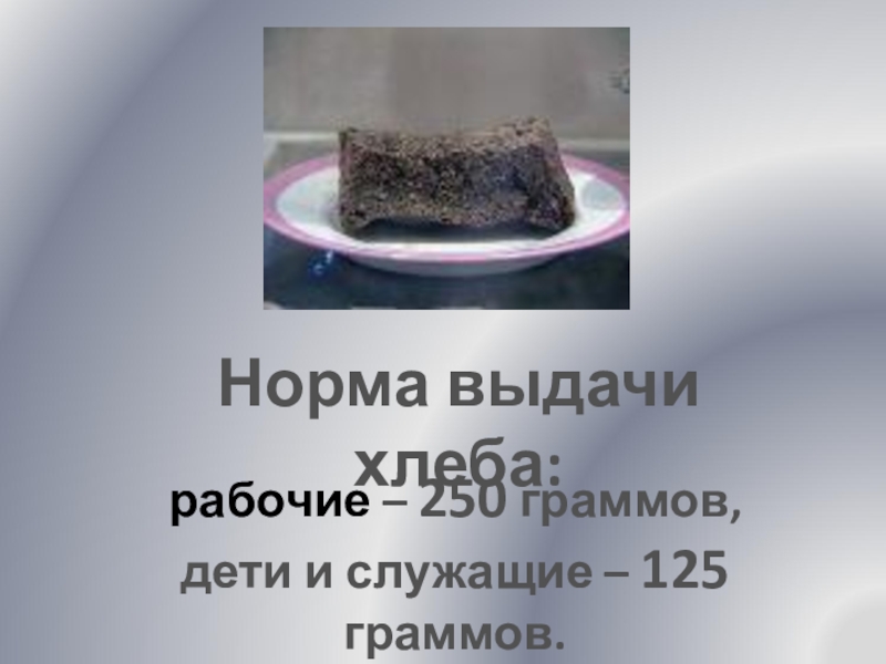 Норма выдачи хлеба:рабочие – 250 граммов,дети и служащие – 125 граммов.