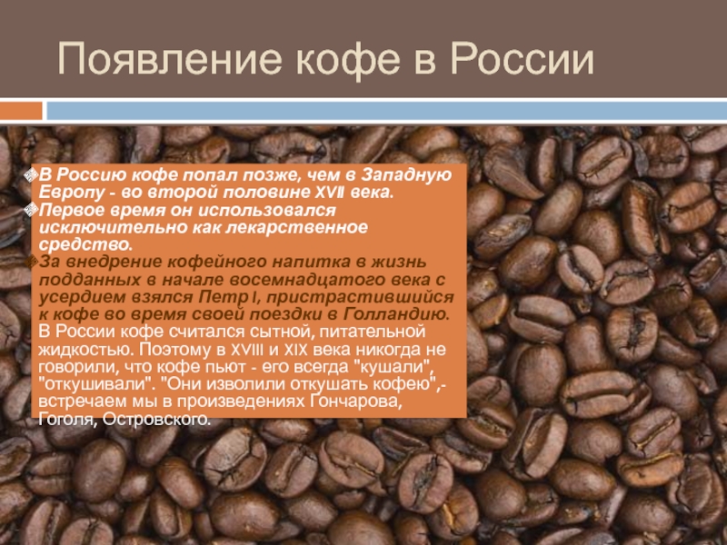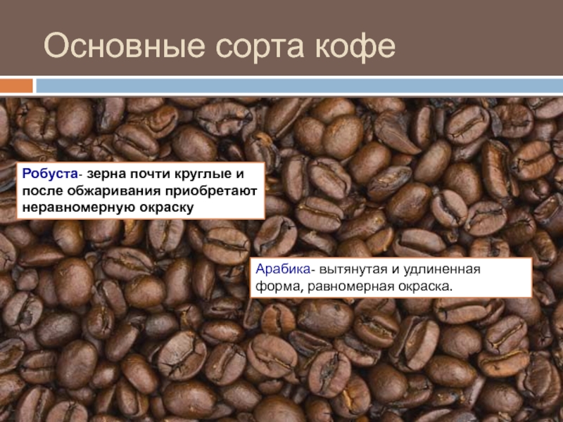 Арабика- вытянутая и удлиненная форма, равномерная окраска.
