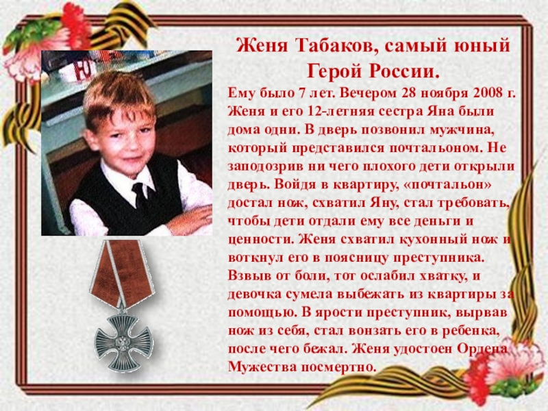 Слайд 34Женя Табаков, самый юный Герой России.