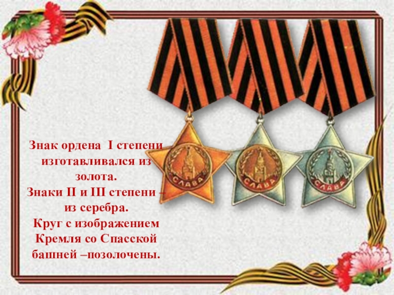 Слайд 16Знак ордена I степени изготавливался из золота.