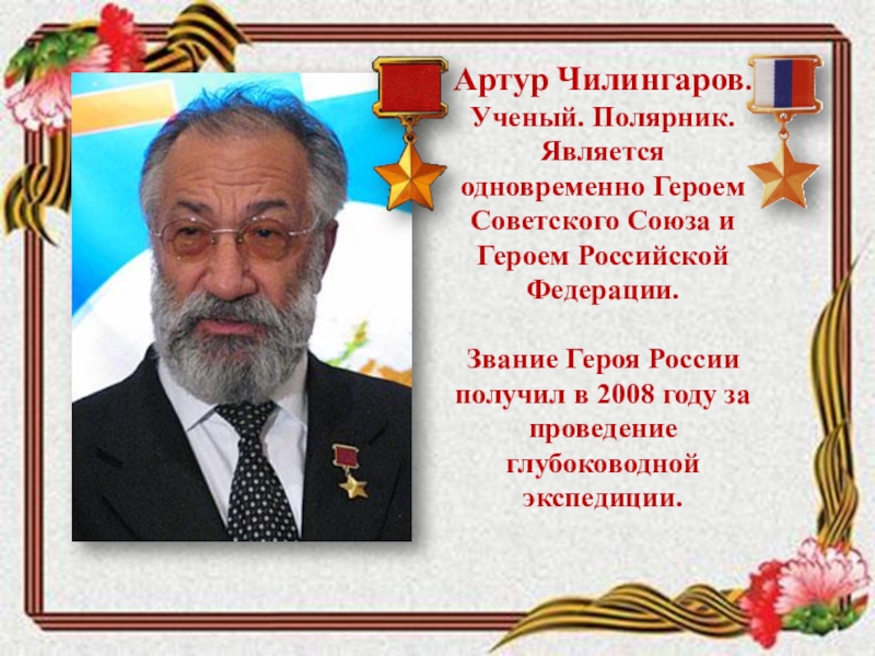Ученый. Полярник. Является одновременно Героем Советского Союза и Героем Российской