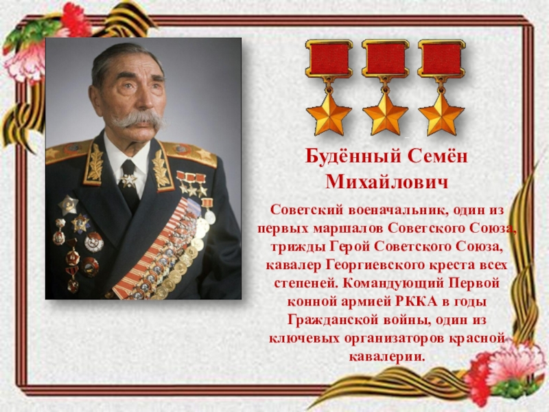 Герой Советского Союза, кавалер Георгиевского креста всех степеней. Командующий Первой конной армией РККА в годы Гражданской войны, один из ключевых организаторов красной кавалерии.