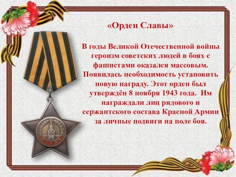 боях с фашистами оказался массовым. Появилась необходимость установить новую награду. Этот орден был утверждён 8 ноября 1943 года. Им награждали лиц рядового и сержантского состава Красной Армии за личные подвиги на поле боя.