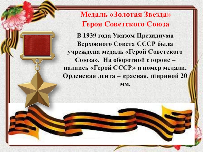 Совета СССР была учреждена медаль «Герой Советского Союза». На оборотной стороне – надпись «Герой СССР» и номер медали. Орденская лента – красная, шириной 20 мм.