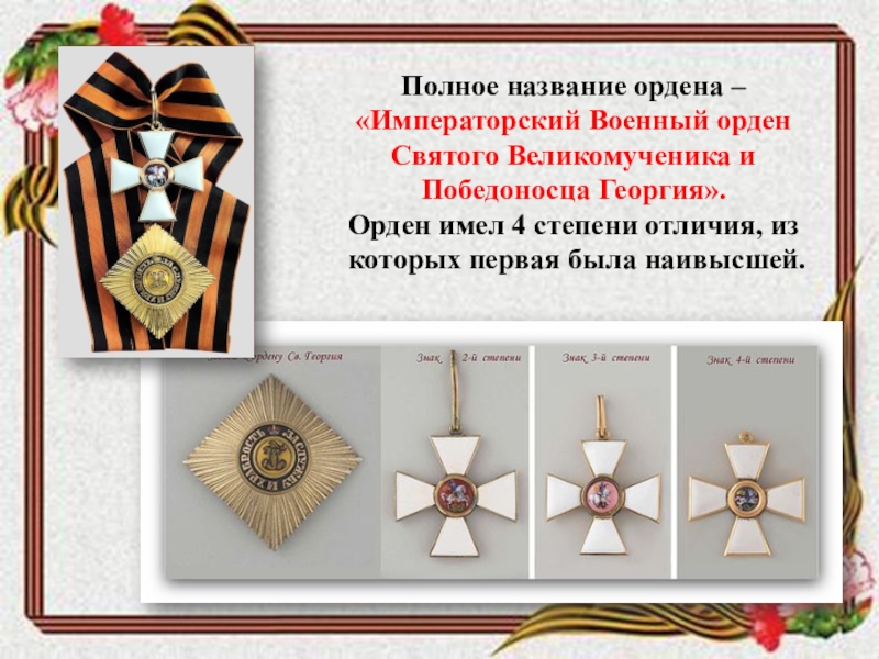 Слайд 7Полное название ордена – «Императорский Военный орден Святого Великомученика и Победоносца