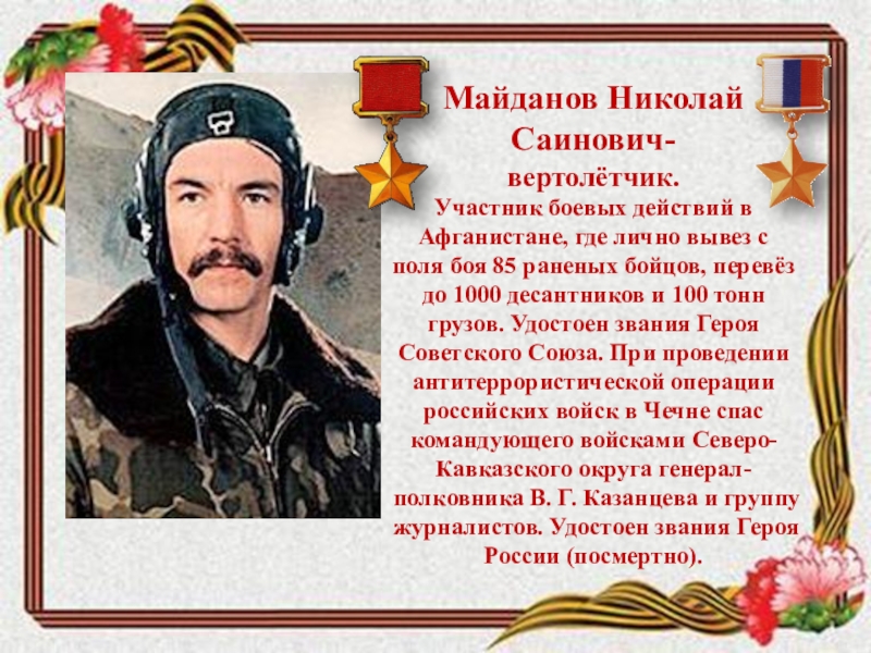 поля боя 85 раненых бойцов, перевёз до 1000 десантников и 100 тонн грузов. Удостоен звания Героя Советского Союза. При проведении антитеррористической операции российских войск в Чечне спас командующего войсками Северо-Кавказского округа генерал-полковника В. Г. Казанцева и группу журналистов. Удостоен звания Героя России (посмертно).