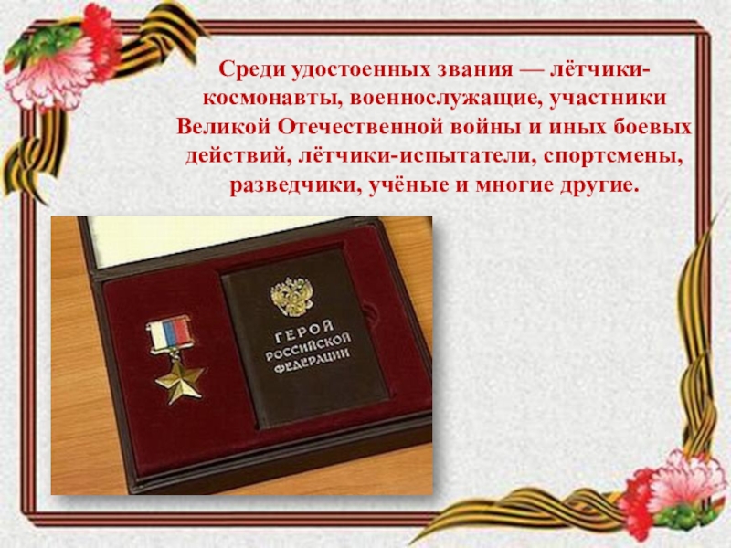 Слайд 28Среди удостоенных звания — лётчики-космонавты, военнослужащие, участники Великой Отечественной войны и иных