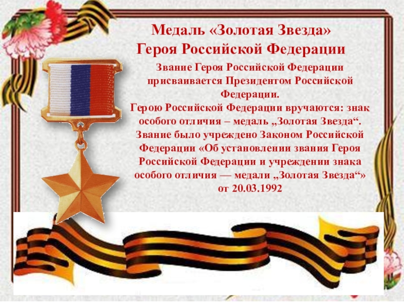 Федерации вручаются: знак особого отличия – медаль „Золотая Звезда“. Звание было учреждено Законом Российской Федерации «Об установлении звания Героя Российской Федерации и учреждении знака особого отличия — медали „Золотая Звезда“» от 20.03.1992