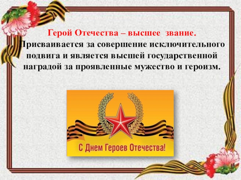 Слайд 2Герой Отечества – высшее звание. Присваивается за совершение исключительного подвига и