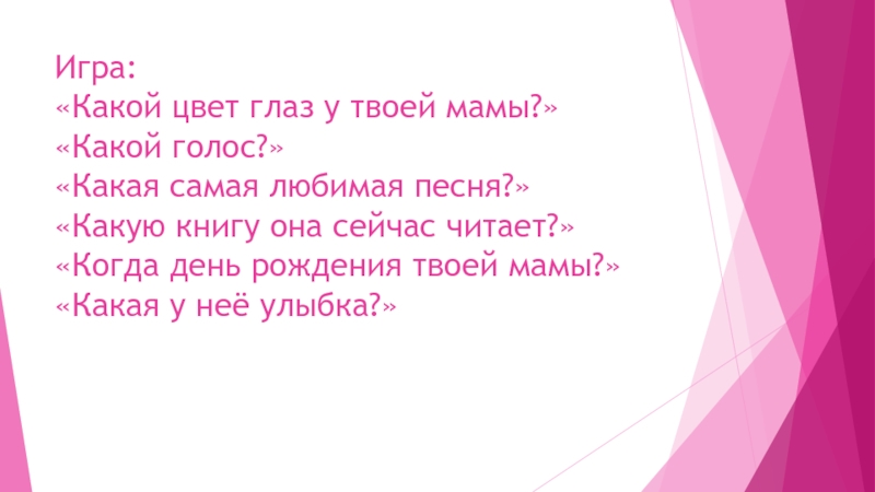 Игра: «Какой цвет глаз у твоей мамы?» «Какой голос?» «Какая самая любимая песня?» «Какую книгу она сейчас