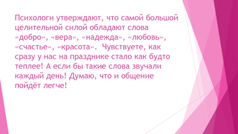 Слайд 3Психологи утверждают, что самой большой целительной силой обладают слова «добро», «вера»,