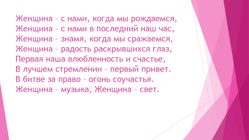 последний наш час, Женщина – знамя, когда мы сражаемся, Женщина – радость раскрывшихся глаз, Первая наша влюбленность и счастье, В лучшем стремлении – первый привет. В битве за право – огонь соучастья. Женщина – музыка, Женщина – свет.