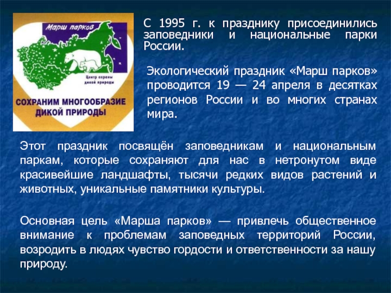 Экологический праздник «Марш парков» проводится 19 — 24 апреля в десятках регионов России и во многих странах мира.