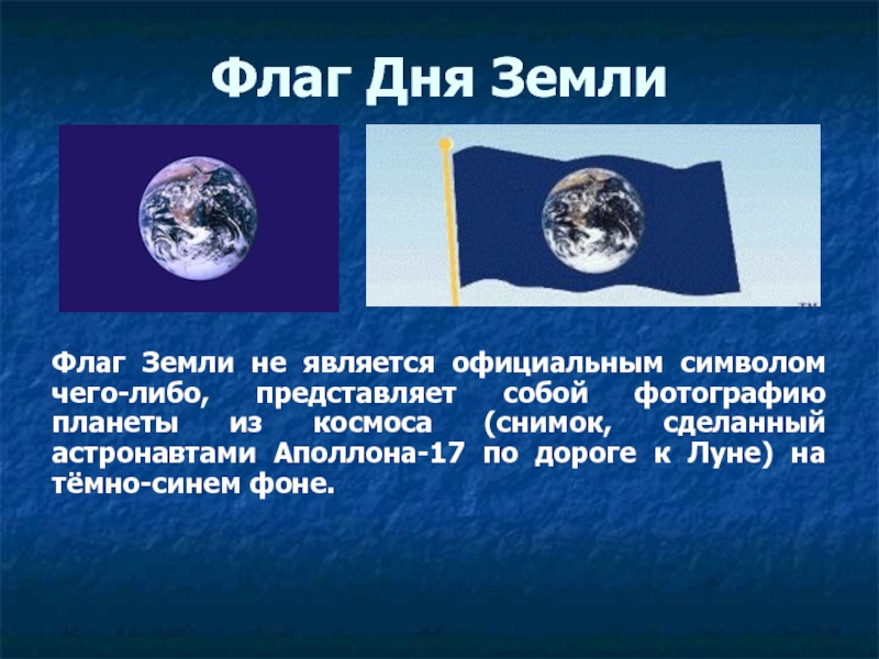 День Земли — название, используемое по отношению к различным мероприятиям, проводящимся весной и призванным побудить людей быть внимательнее к хрупкой и уязвимой окружающей среде на планете Земля.