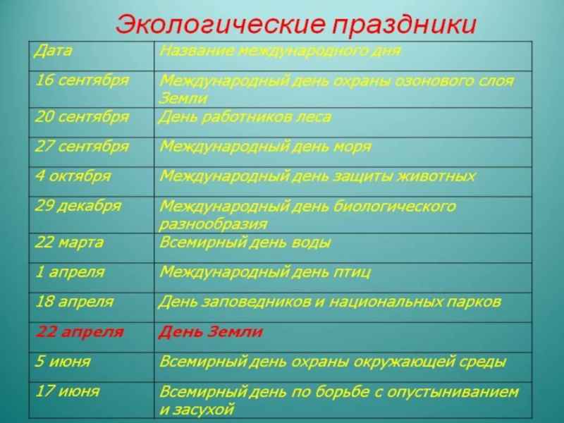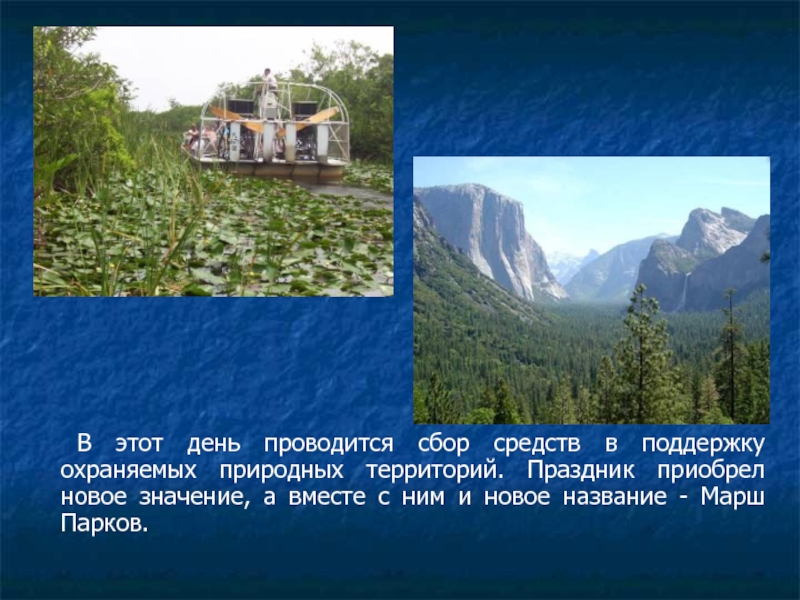Этот праздник посвящён заповедникам и национальным паркам, которые сохраняют для нас в нетронутом виде красивейшие ландшафты, тысячи редких видов растений и животных, уникальные памятники культуры.