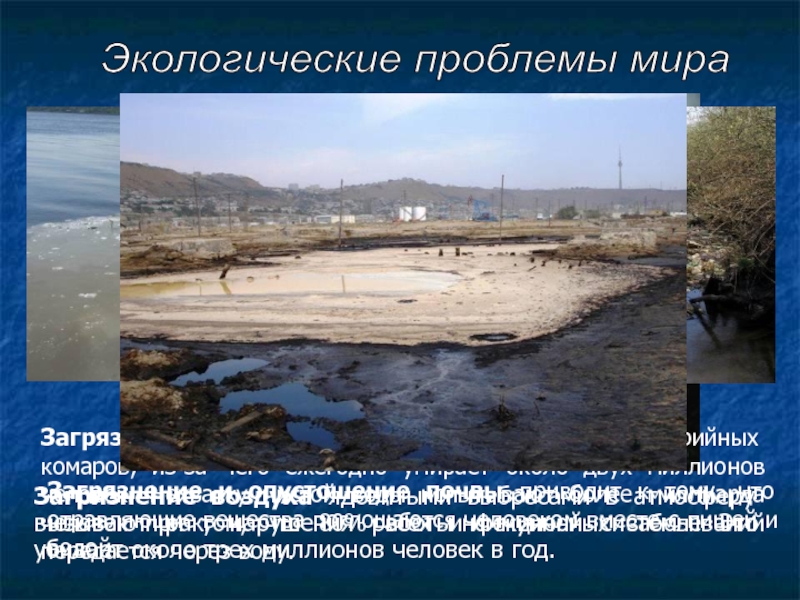 Загрязнение воды приводит к размножению малярийных комаров, из-за чего ежегодно умирает около двух миллионов человек. Нехватку чистой воды испытывают более миллиарда человек при том, что 80% всех инфекционных заболеваний передается через воду.