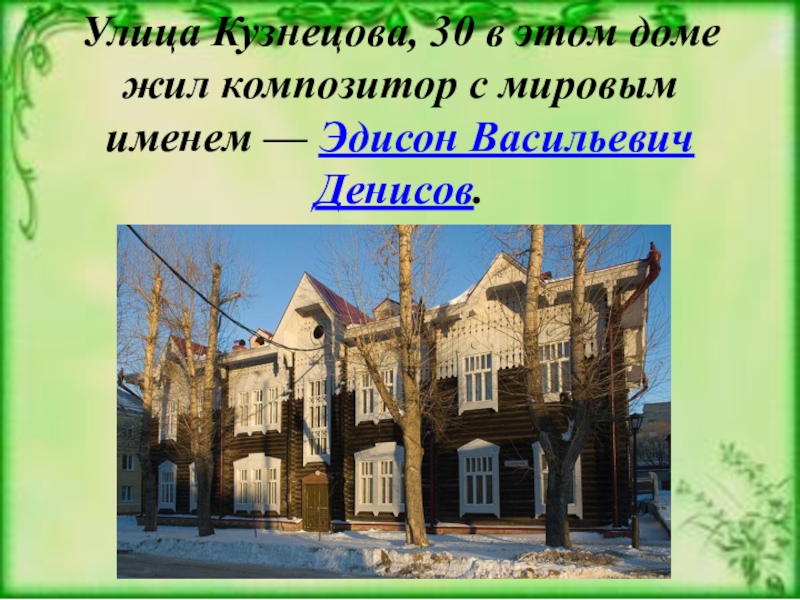 Улица Кузнецова, 30 в этом доме жил композитор с мировым именем — Эдисон Васильевич Денисов.