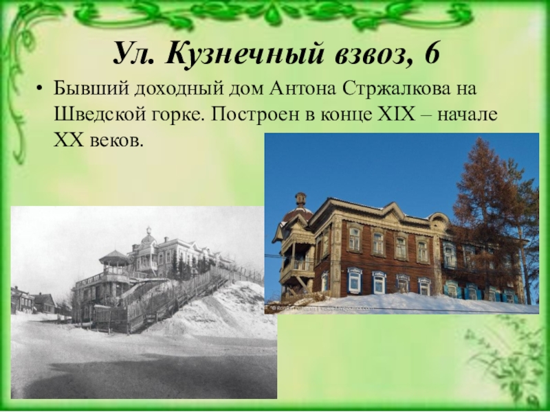 Ул. Кузнечный взвоз, 6Бывший доходный дом Антона Стржалкова на Шведской горке. Построен в конце XIX – начале XX