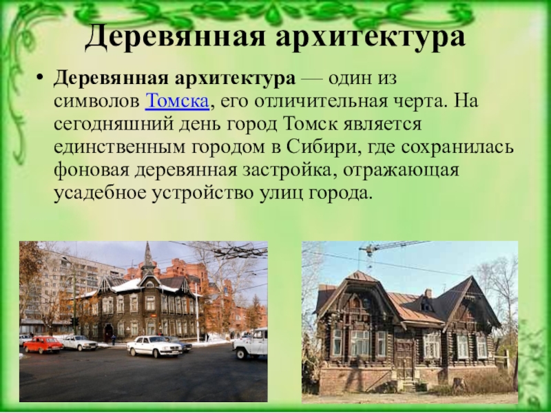 Деревянная архитектураДеревянная архитектура — один из символов Томска, его отличительная черта. На сегодняшний день город Томск является единственным городом в Сибири, где сохранилась фоновая деревянная застройка, отражающая усадебное устройство улиц города.