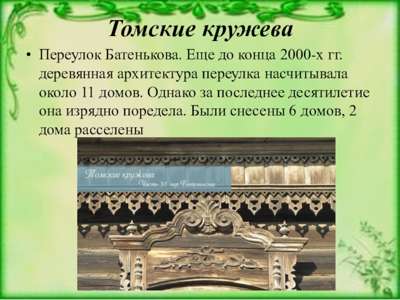 Томские кружеваПереулок Батенькова. Еще до конца 2000-х гг. деревянная архитектура переулка насчитывала около 11 домов. Однако за