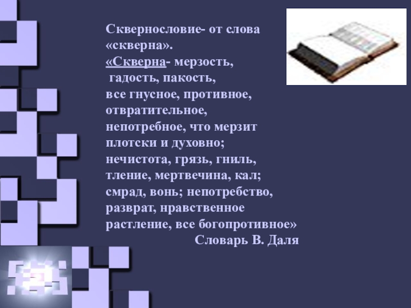 нечистота, грязь, гниль, тление, мертвечина, кал; смрад, вонь; непотребство, разврат, нравственное растление, все богопротивное»