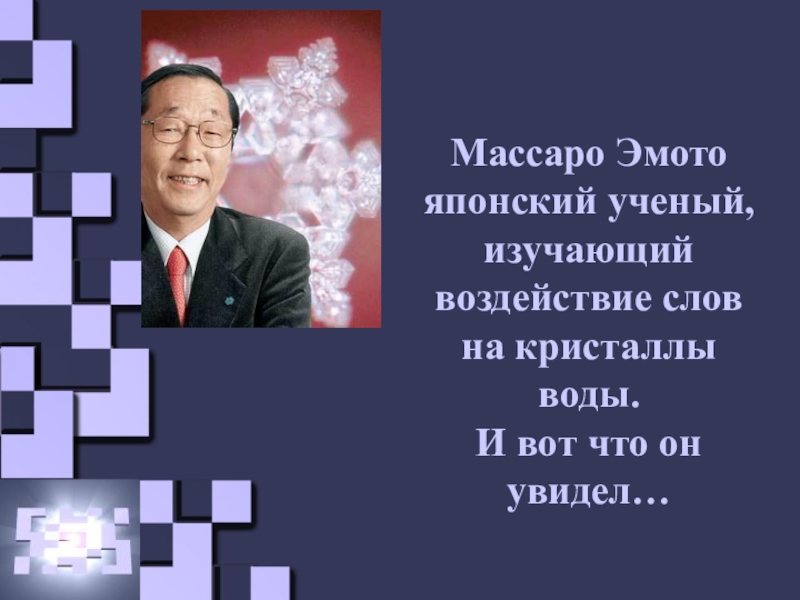 Слайд 21Массаро Эмото японский ученый, изучающий воздействие слов на кристаллы воды.