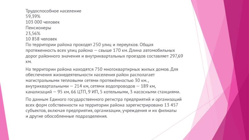 Трудоспособное население 59,39% 103 000 человек Пенсионеры 23,56% 10 858 человек По территории района проходят 250 улиц и переулков. Общая