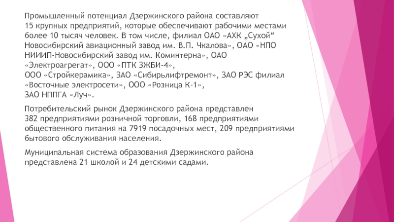 Слайд 9Промышленный потенциал Дзержинского района составляют 15 крупных предприятий, которые обеспечивают рабочими местами