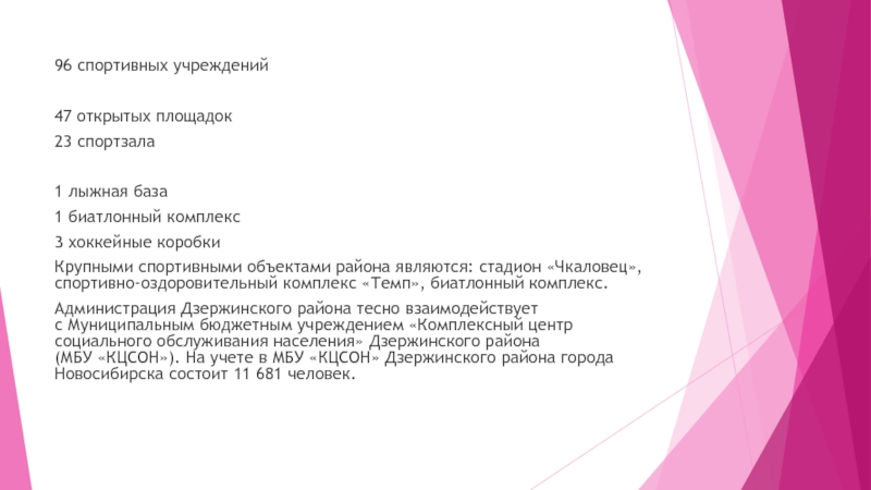 96 спортивных учреждений 47 открытых площадок 23 спортзала  1 лыжная база 1 биатлонный комплекс 3 хоккейные коробки