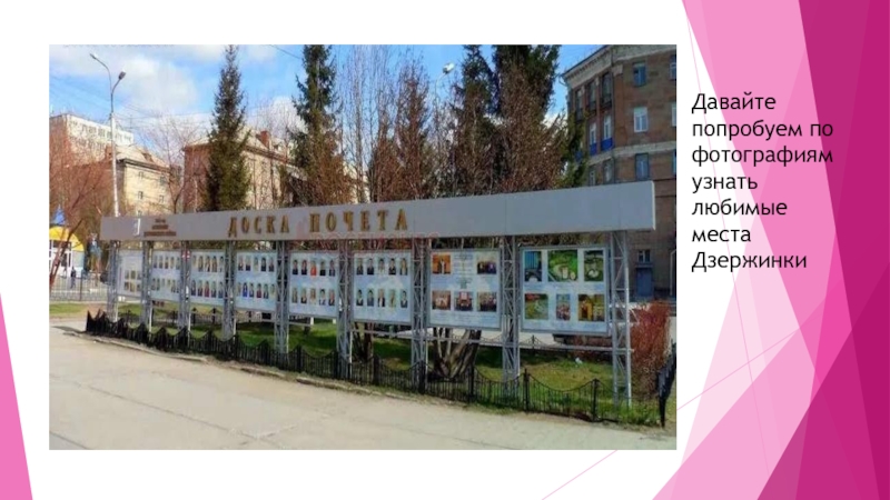 Слайд 13Давайте попробуем по фотографиям узнать любимые места Дзержинки